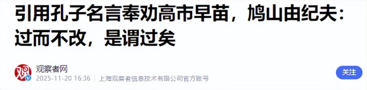 11月份日本前首相鸠山由纪夫,他在公开采访中搬出《论语》,忠言逆耳地骂道:“慎言、慎行、慎思,大国之间的火不能拿棒子捅。”