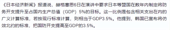 《日本经济新闻》报道说,赫格塞思12月6日在演讲中要求日本等盟国在数年内制定将防务开支提升至占国内生产总值(GDP)5%的目标,这几乎是翻倍增长。